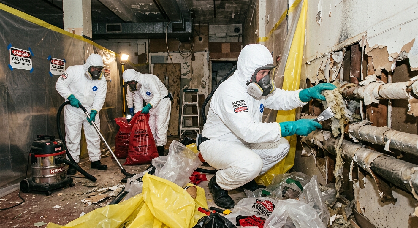 Retrait sécuritaire de matériaux amiantés selon les normes CNESST. Équipes en scaphandre.