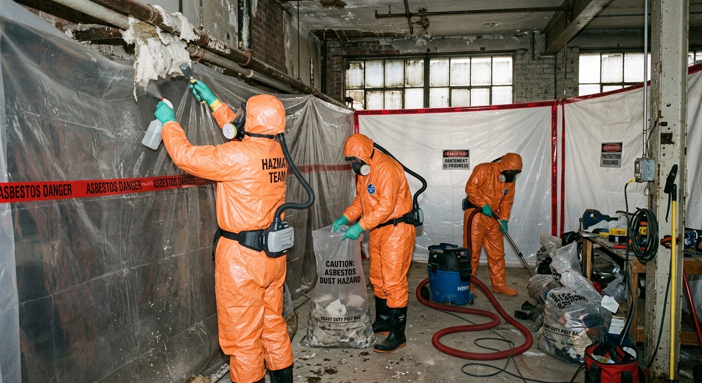 Retrait sécuritaire de matériaux amiantés selon les normes CNESST. Équipes en scaphandre.