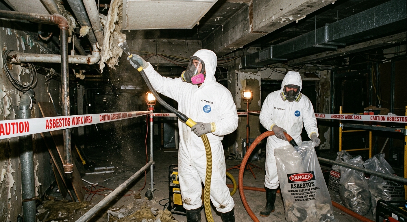 Retrait sécuritaire de matériaux amiantés selon les normes CNESST. Équipes en scaphandre.