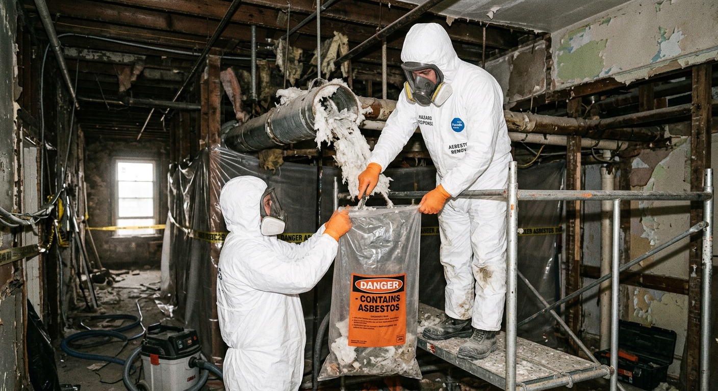 Retrait sécuritaire de matériaux amiantés selon les normes CNESST. Équipes en scaphandre.