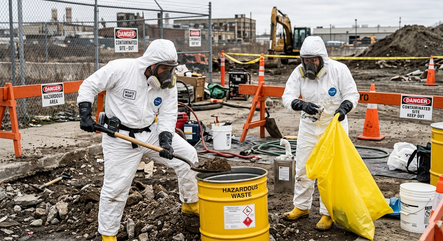 Retrait sécuritaire de matériaux amiantés selon les normes CNESST. Équipes en scaphandre.