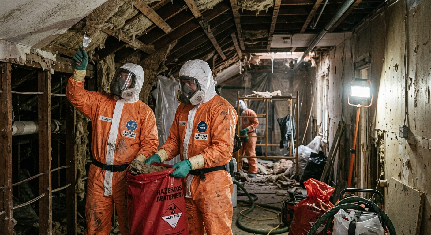 Retrait sécuritaire de matériaux amiantés selon les normes CNESST. Équipes en scaphandre.
