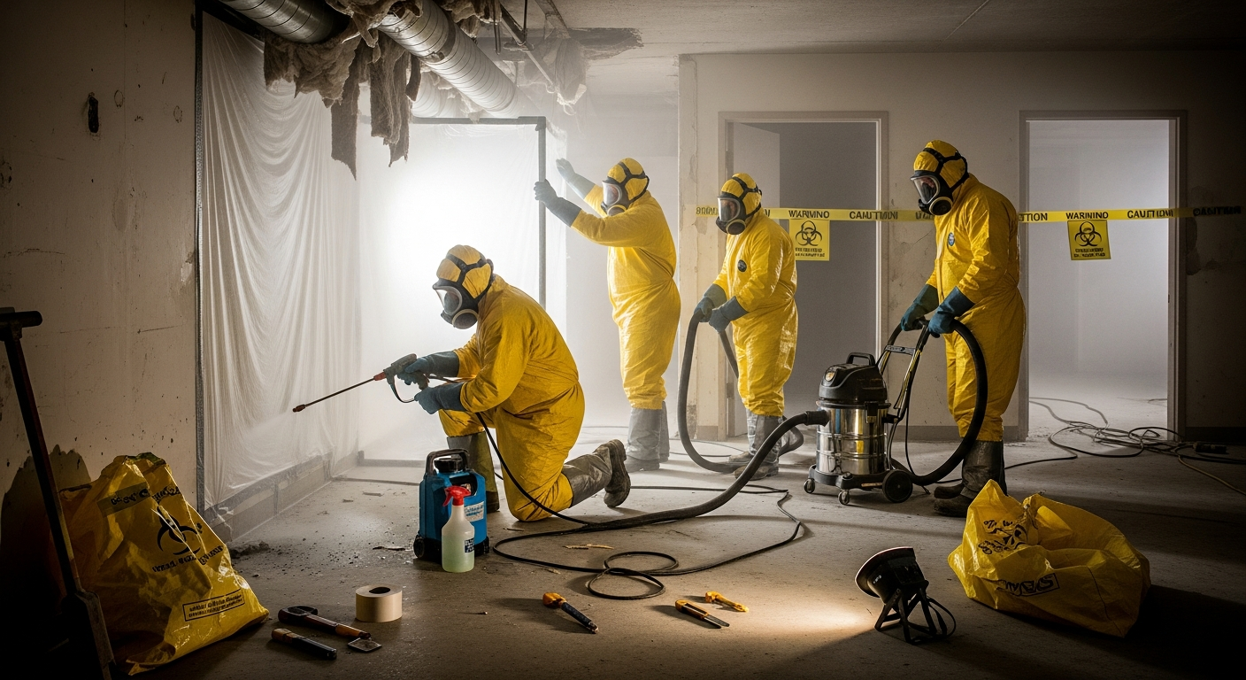 Retrait sécuritaire de matériaux amiantés selon les normes CNESST. Équipes en scaphandre.