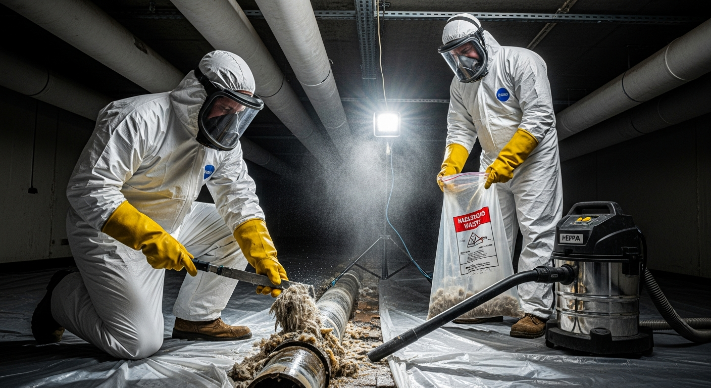 Retrait sécuritaire de matériaux amiantés selon les normes CNESST. Équipes en scaphandre.