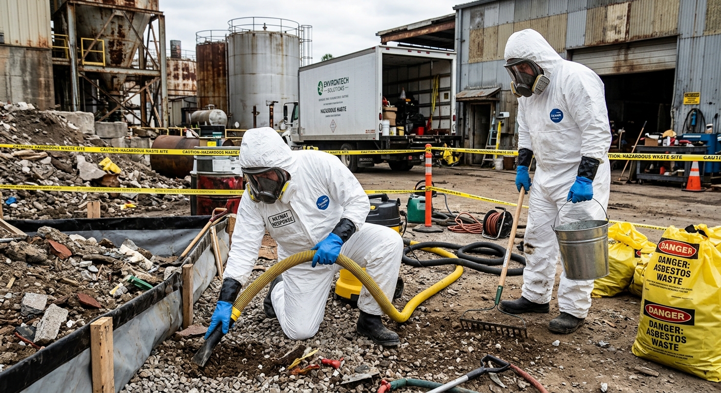 Retrait sécuritaire de matériaux amiantés selon les normes CNESST. Équipes en scaphandre.